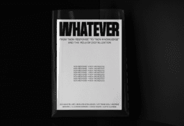 Whatever (From "Non-Response" to "Non-Knowledge" and the role of digitalization) is a book compiling texts from Jean Baudrillard, Matthias Koch, Andreas Bernard, Alexandre Monnin, Ahmed Ansari and Justin Clemens. The texts reflect on the transition from traditional to new media, and how both have affected and impacted generations of receptors.